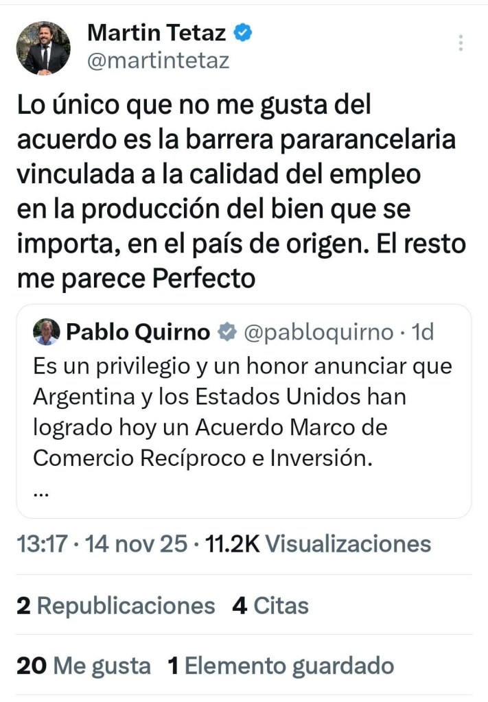 Lo que nos quiere decir Martín Tetaz, es que Javier Milei ha logrado un buen acuerdo para Argentina y que su única objeción es una cláusula que exige evaluar la calidad del empleo del país que produce los bienes que se importan. Él podría entender que es un freno comercial encubierto y es totalmente válido que pueda expresarse desde su visión liberal moderada. En lo particular, no considero que se promueva a trabas innecesarias para aquellos que quieren producir y comerciar.