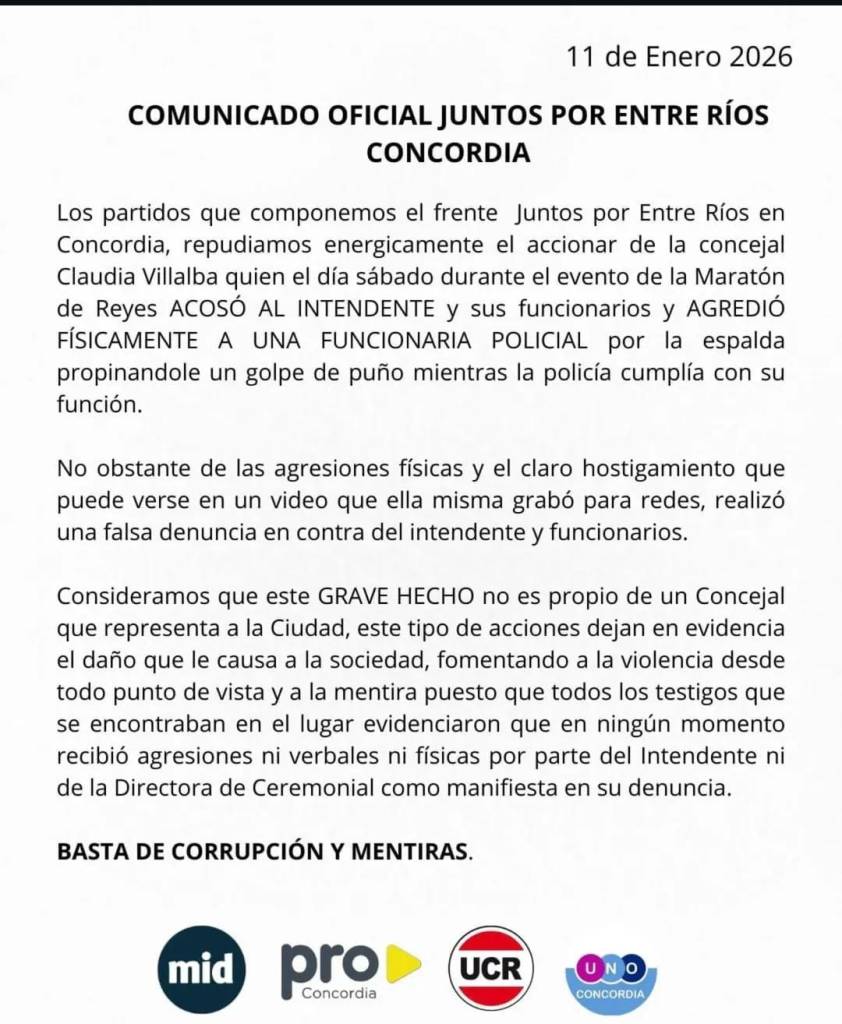 Tras los hechos, los partidos que integran el frente Juntos por Entre Ríos en Concordia PRO, MID, UCR y UNO emitieron un comunicado oficial en el que repudiaron de manera enérgica el accionar de la edil. El texto sostiene que Villalba acosó al intendente y a funcionarios municipales y que además agredió físicamente por la espalda a una funcionaria policial mientras cumplía su tarea de custodia durante el evento.