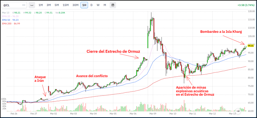 Como podemos ver en el siguiente gráfico, con la cotización del precio del petróleo hora a hora
